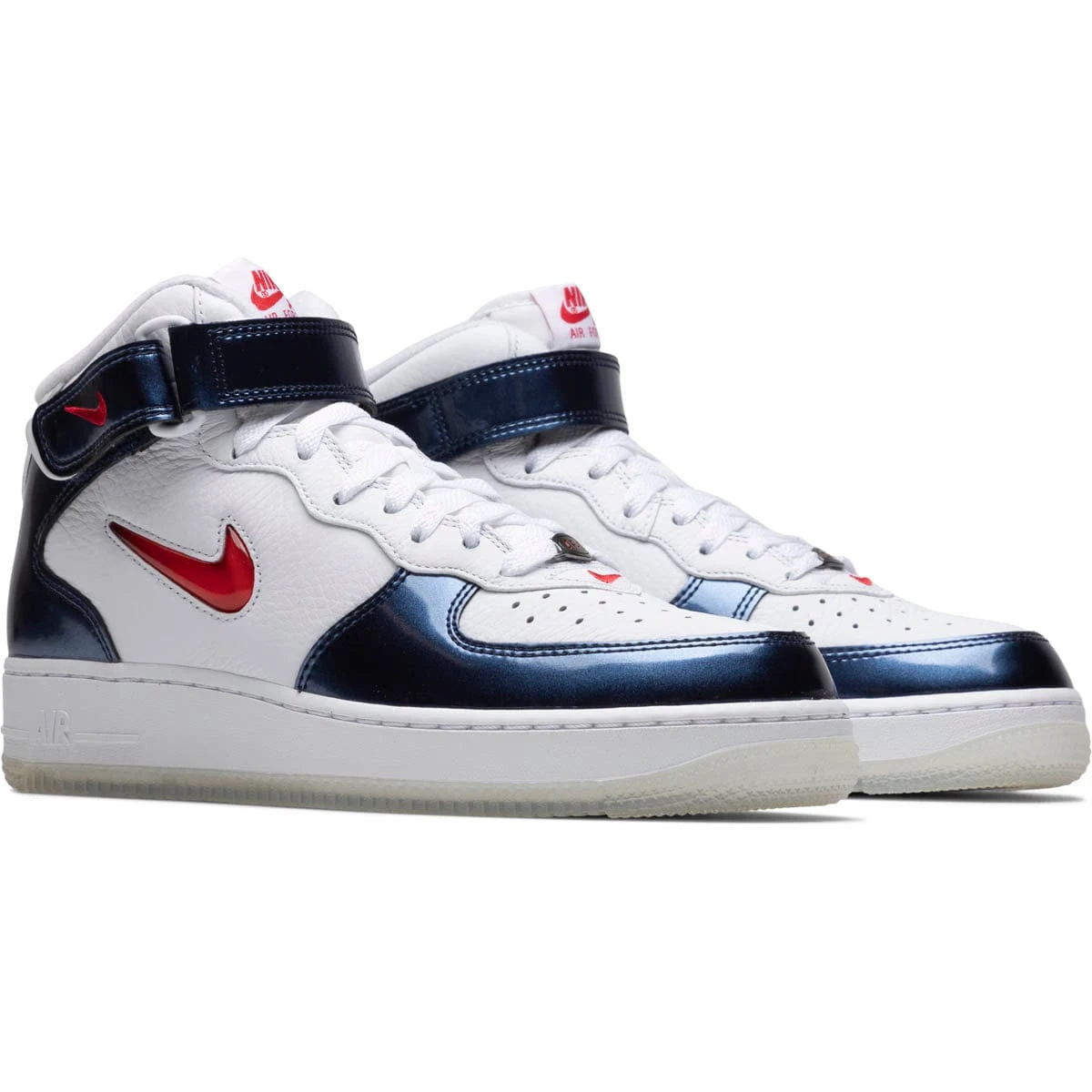 Mid-top not “mid”. The middle child in the Air Force 1 family does not get the Goldilocks level praise it deserves even though its not too high and not too low. But with color ways like this Independence Day release, a jeweled Nike logo, and glossy accents throughout, the tide has no choice but to shift.