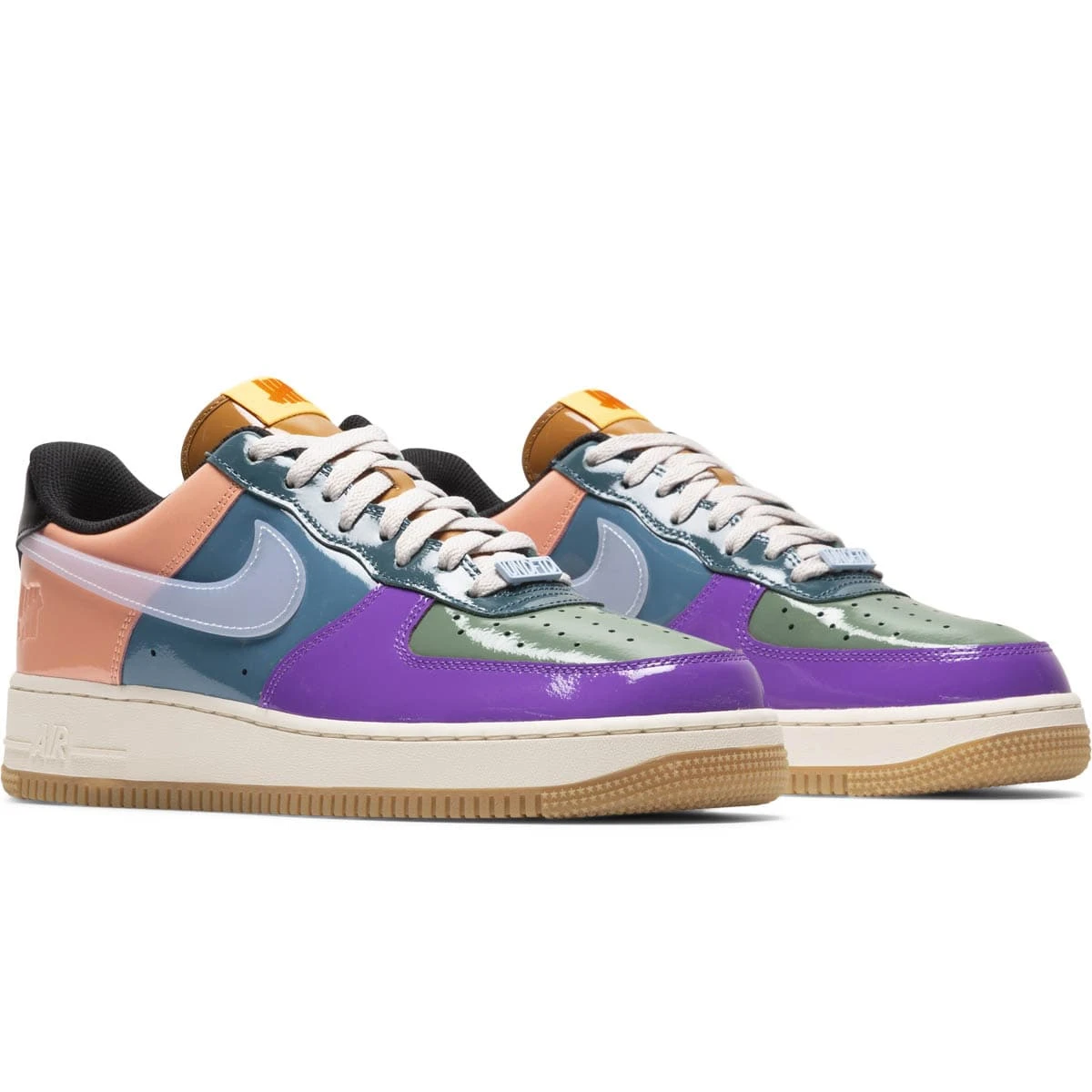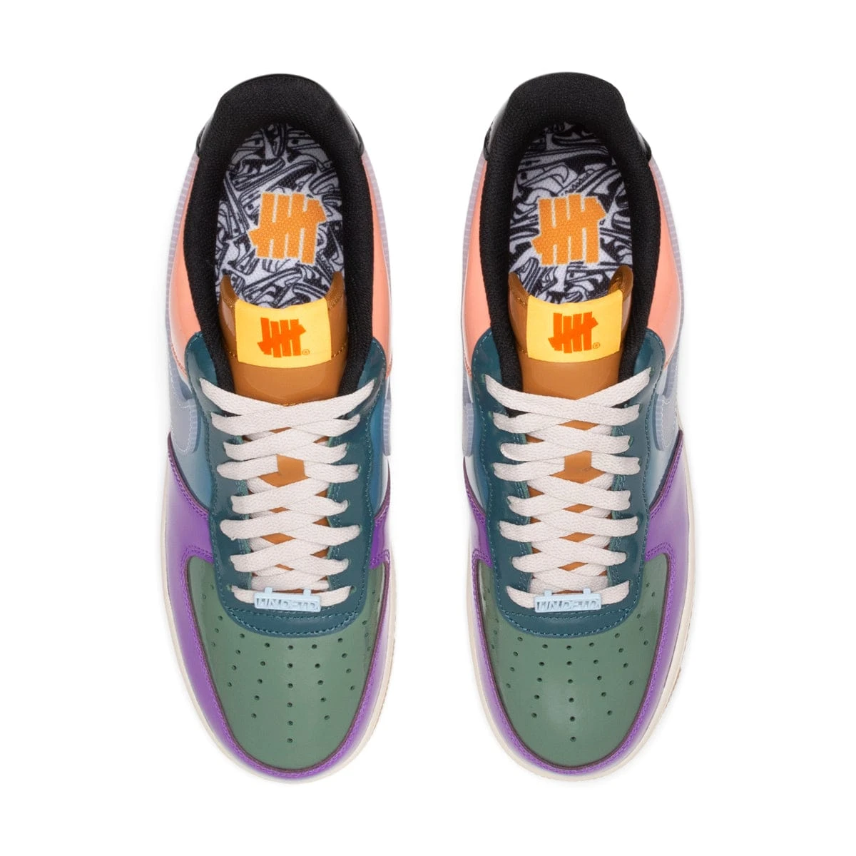 Celebrating the Air Force 1’s 40th anniversary, Nike and Undefeated team up again for another iconic release. The full patent leather construction is now draped in a “Celestine Blue” color profile – an eye-catching array of lavender, lime green, teal, peach, and black. Not to be missed are the UNDFTD lace locks, five strikes insignia debossed on the lateral heel as well as the tongue and insole.