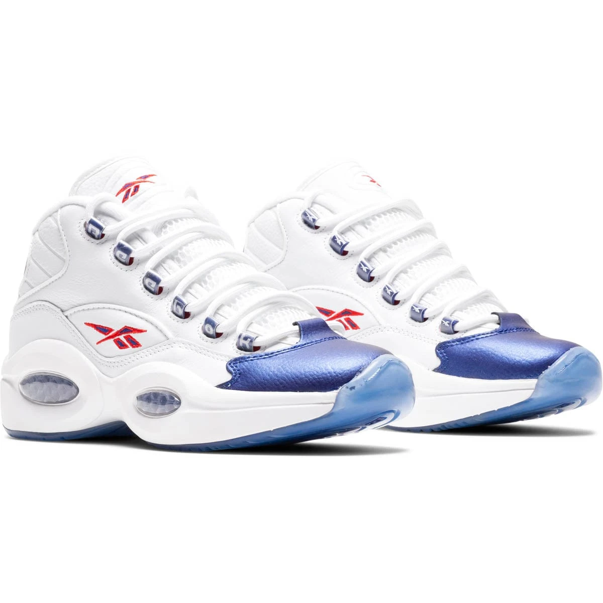 The Question Mid is the latest in Reebok’s continuation of Allen Iverson retros for 2022. Commemorating 25 years since Iverson’s iconic crossover moment from his rookie season, the sneakers feature a white tumbled leather upper with blue pearlized overlays and branding throughout, all of which contribute to its groundbreaking design.