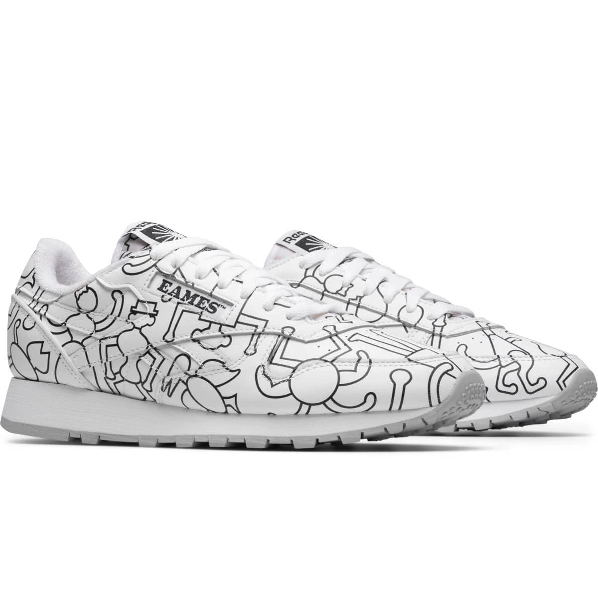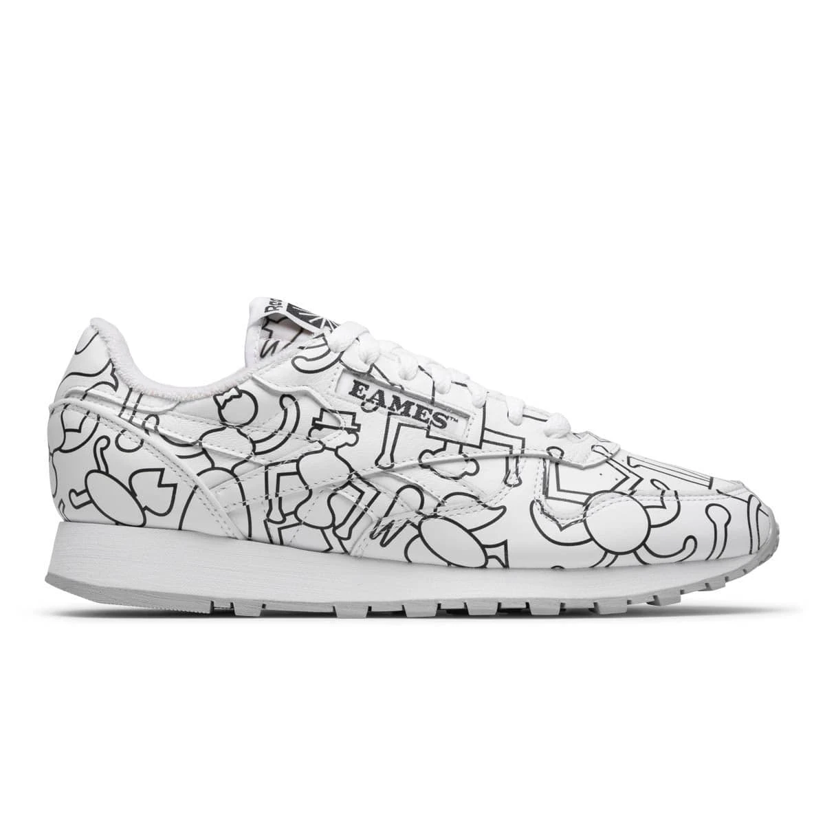 Mid-century design meets retro ’80s Reebok style. The legendary designers who started Eames inspire the look of these Classic Leather shoes. Clean sneakers get a bump up with an Eames logo and signature sockliners. A supple leather upper with a wood grain design gives you a luxe touch.