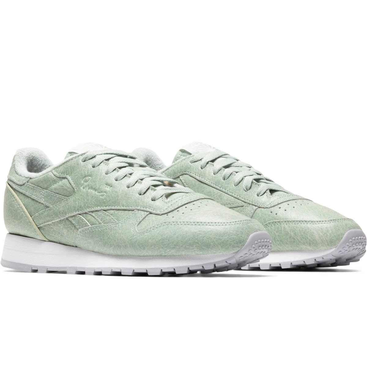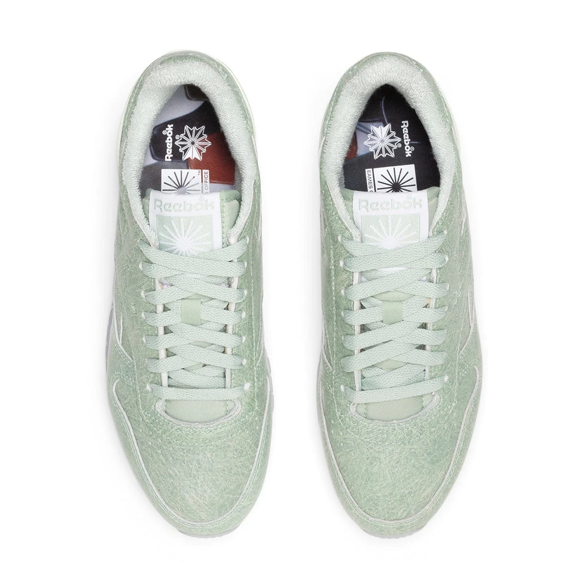The designers of Eames teams up with Reebok for a classic style with a luxury touch. The sage green leather kicks feature the Eames logo and the signature co-branded sockliner. The textured look of the leather is reminiscent of the Eames ’50s shell armchair.Â