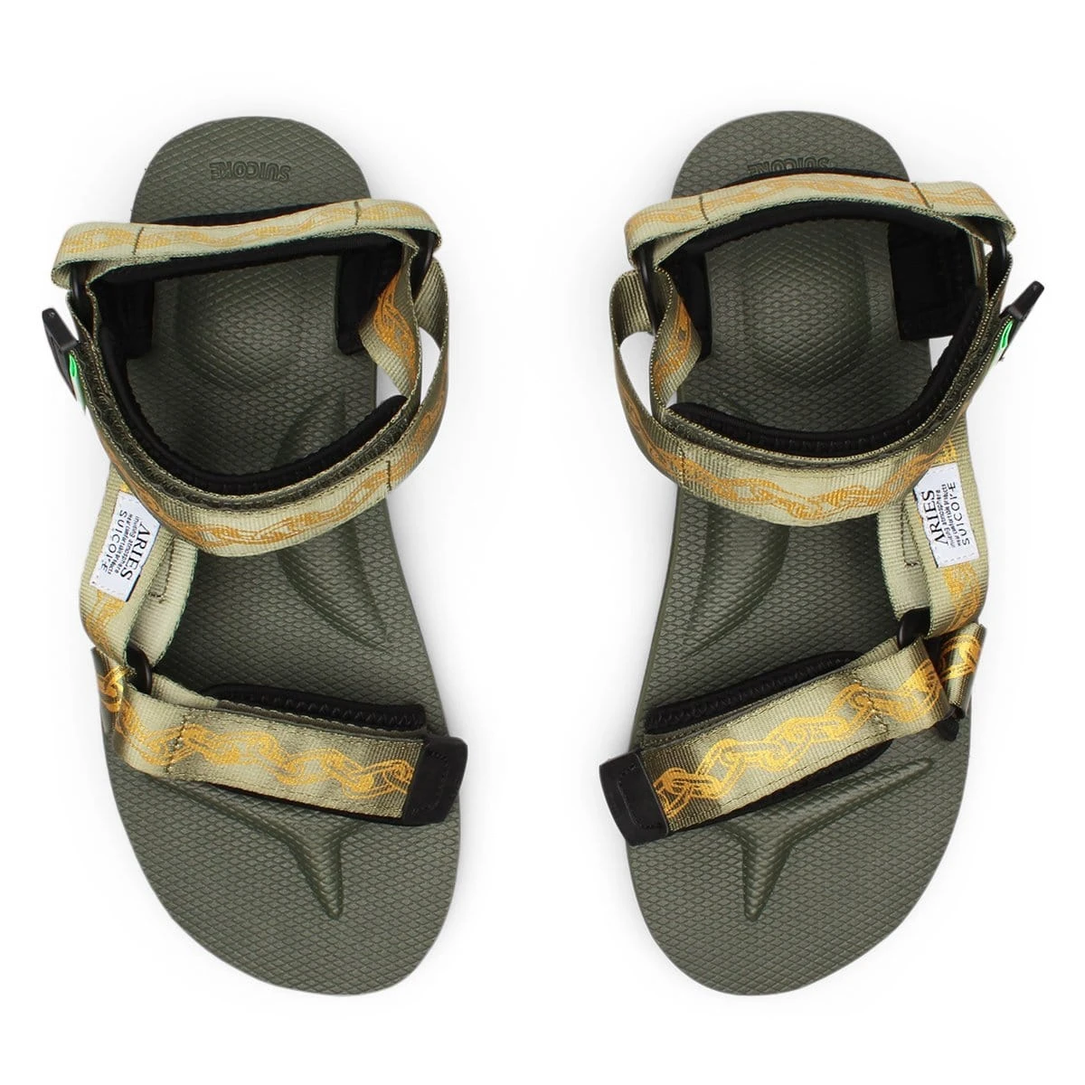 A collaborative effort with London streetwear label Aries infuses the progressive functionality of Suicoke’s Depa V2 silhouette with a bold, contemporary fashion edge, as the sandal’s straps feature a gold toned, chain graphic print and a co-branding patch.Â