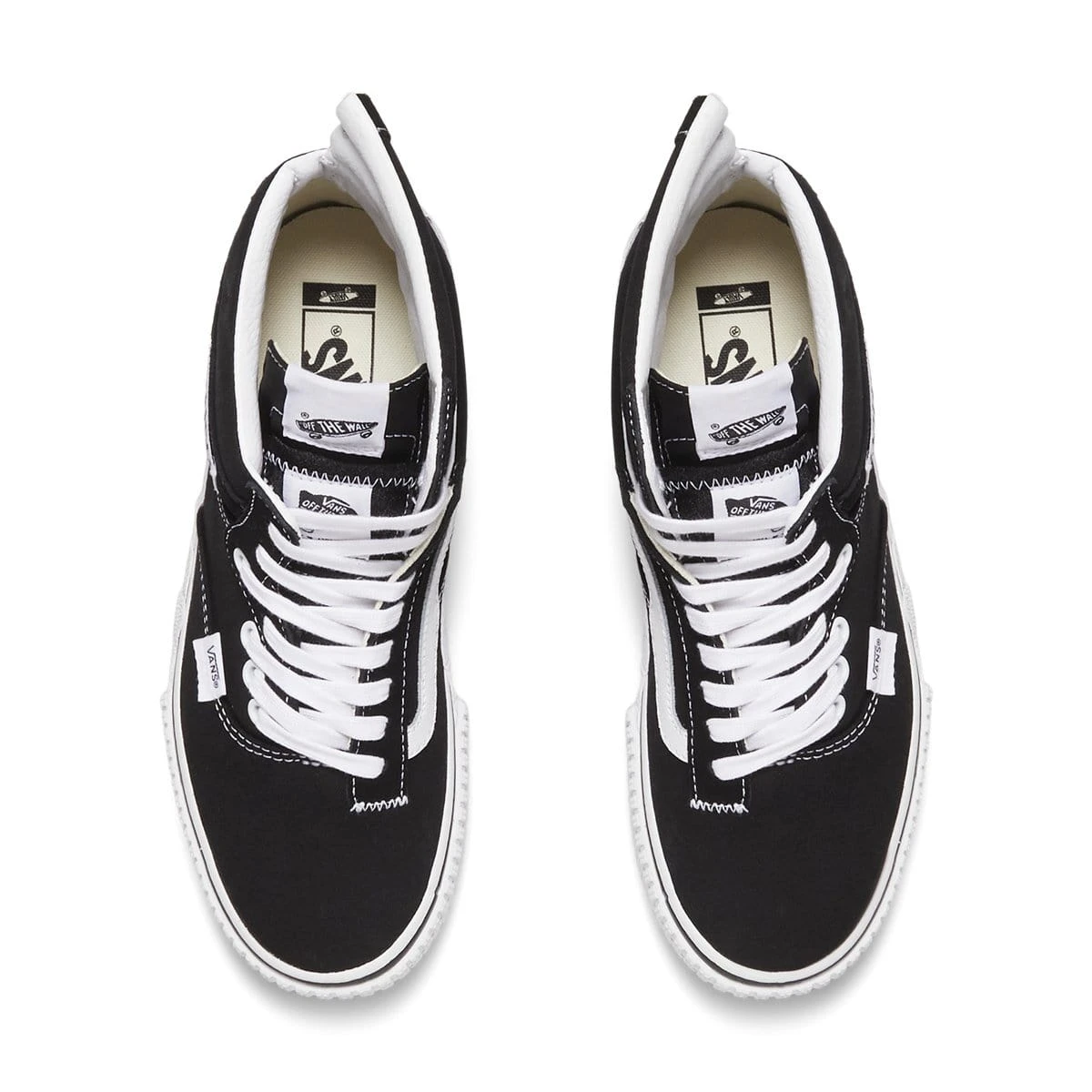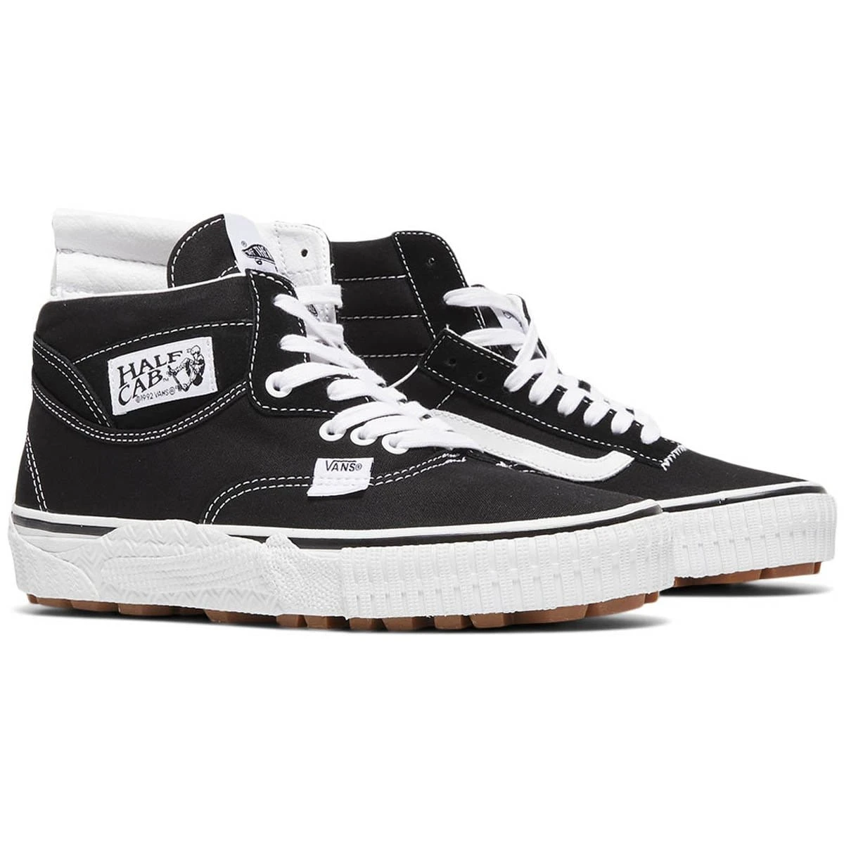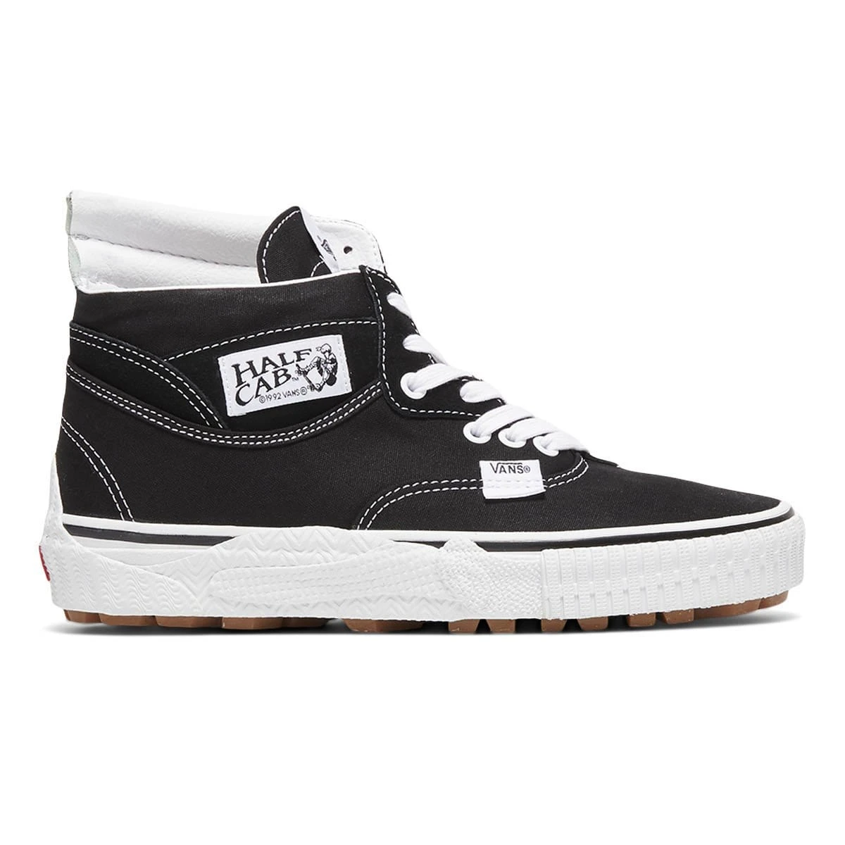 Features from the Authentic appear most evidently on the lower midsole and toe cap while the extended height of the silhouette follows the construction of the Half Cab including its definitive side tag. On the medial side, it’s the Sk8-Hi and the Old Skool whose defining characteristics are most prevalent.