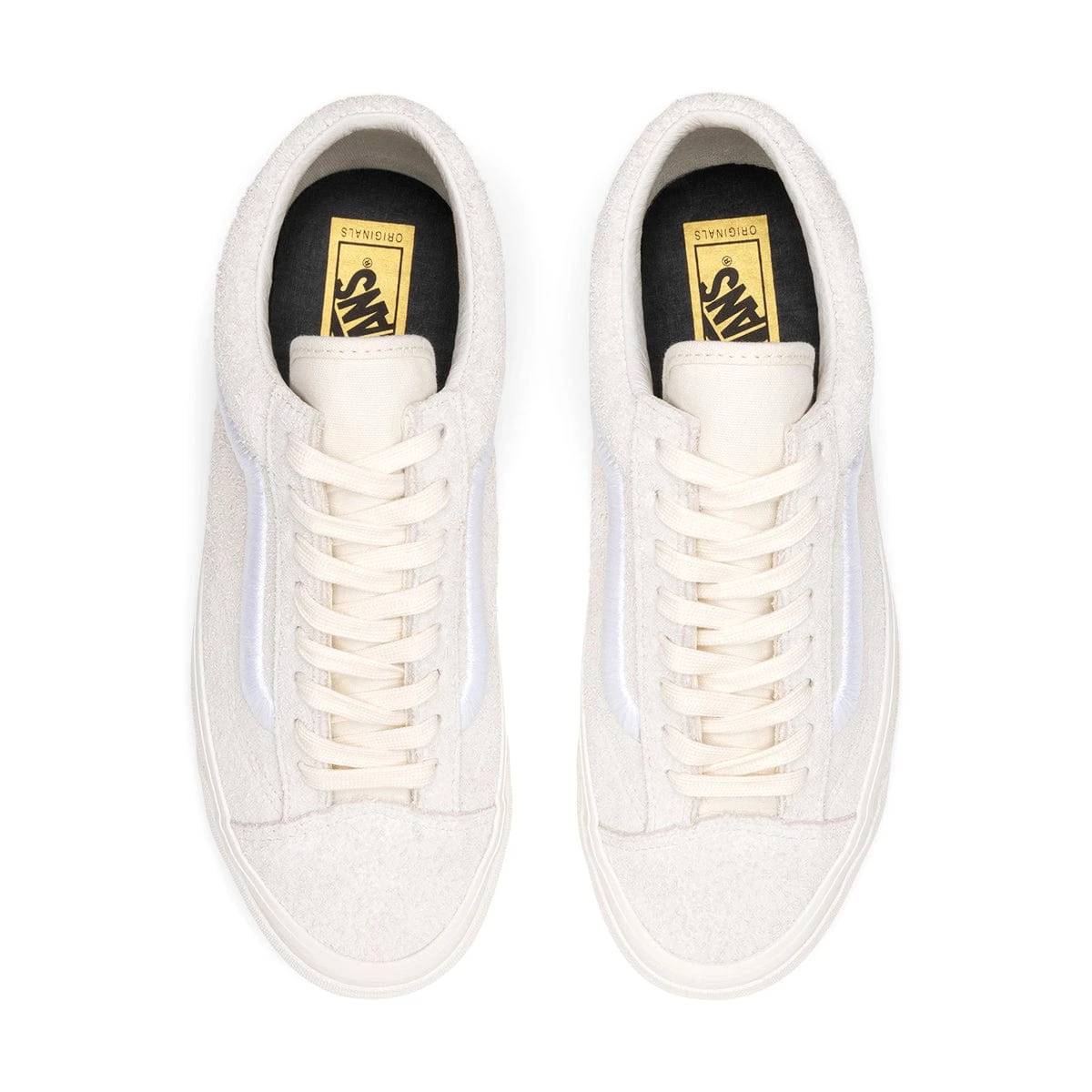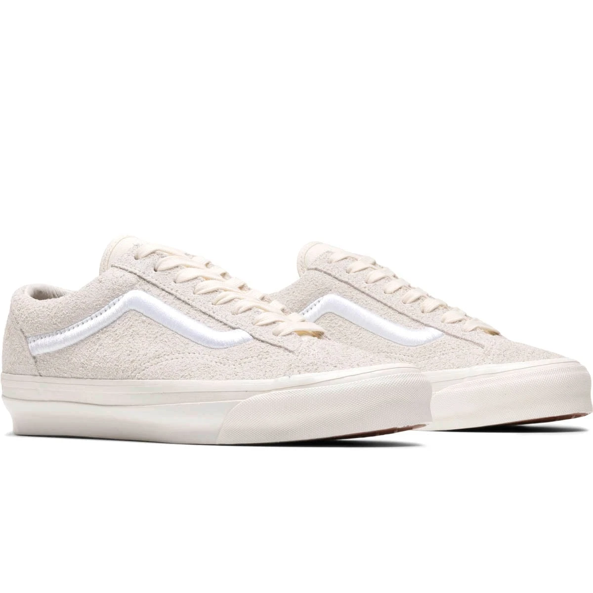 Vans Vault has revamped the timeless Style 36 by incorporating contrasting textures into this striking off-white pair. Boasting fuzzy suede uppers, the design is completed with a bold white side-stripe and the brand’s signature rubber patch at the heel.Â