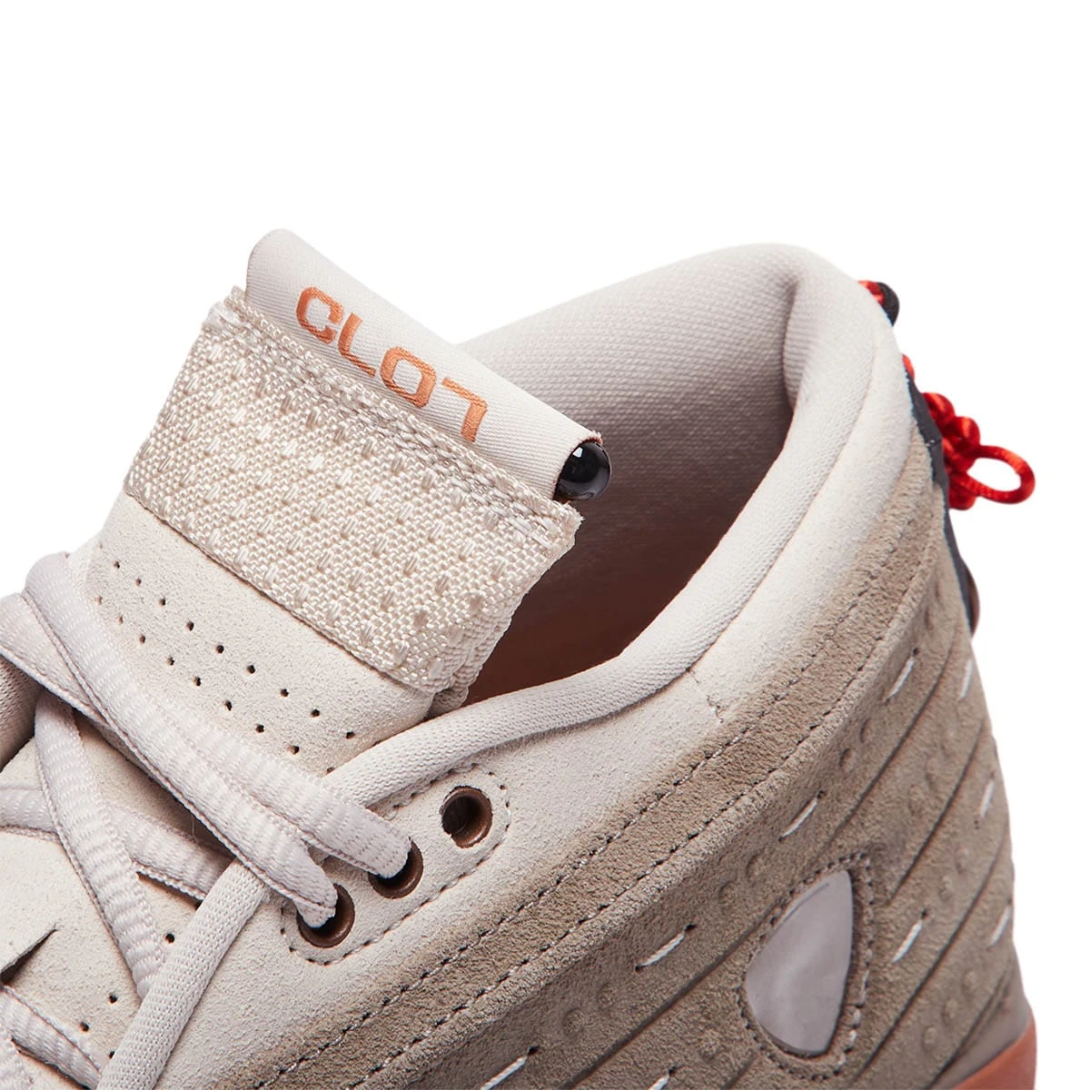 Influential Hong Kong imprint CLOT have outfitted the opulence of the Jordan 14 with colors and motifs inspired by traditional Chinese elements. A suede upper features a ‘sepia stone,’ ‘terra blush,’ and ‘desert sand’ colorway; a tribute to the terracotta army discovered in the tomb of Emperor Qin Shi Huang. The co-branded tongue features an ornamental embellishment in the style of a traditional scroll, while the prosperity symbol of a knot and coin are attached to the shoe’s heel.